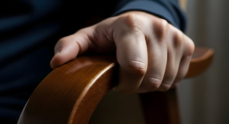 A close-up, dramatic shot of a man's hand tightly gripping the curved, polished wooden armrest of a chair. The person is wearing a dark blue long-sleeved shirt. The focused lighting and tight grip can suggest tension, contemplation, waiting, or stress.