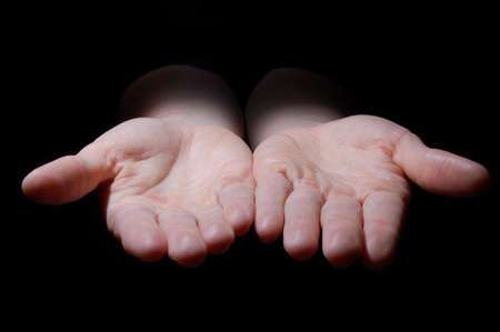 A close-up of open hands presented forward, as if offering or requesting something, with a blurred background adding focus.