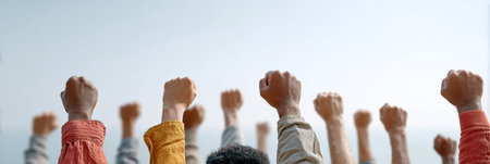 Many hands and arms of different ethnicities are rising up in the air, making fists as a sign of protest, strength, and unity against a clear blue sky