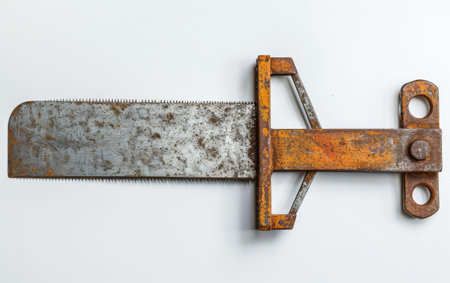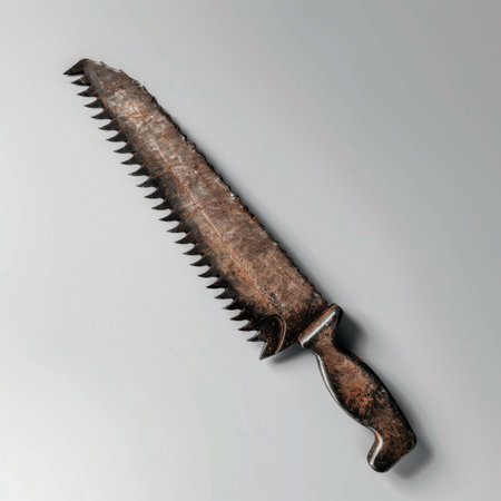 A detailed close-up image of a vintage hand saw resting on a rustic wooden surface, showcasing the tool's blade and texture with soft shadows and light.