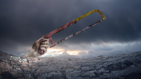 Zombie hand with wounds and blood holding a handsaw behind a tree bark surface with dark and dramatic cloudscape background. Concept of Spooky Halloween