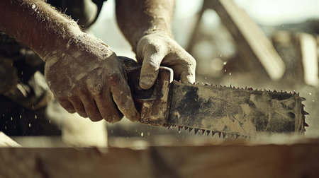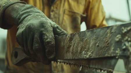 Detail shot of a worker's hand tightly gripping a worn hand saw, showcasing the texture and grit of manual work in a dusty and rustic environment.