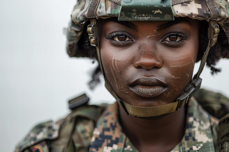 A fierce woman in military attire stands proudly, gripping a rifle as a symbol of her courage and determination.