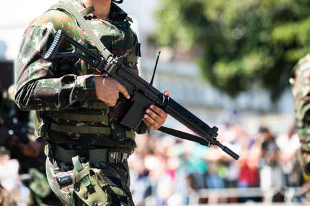 Infantry army soldier hand holding machine gun for security guard standing with space for text.
