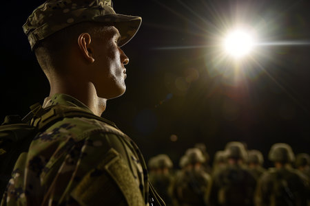 A group of soldiers stands in formation, showcasing discipline and unity during a military parade. Their serious expressions reflect dedication and pride in service.