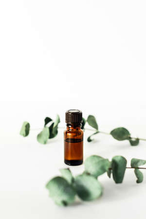A bottle of fragrant cosmetic or essential oil on a white background surrounded by sprigs of eucalyptus.