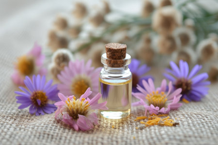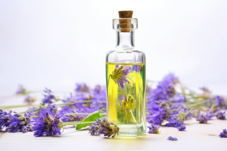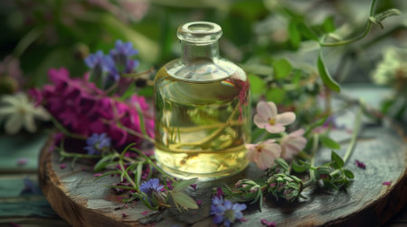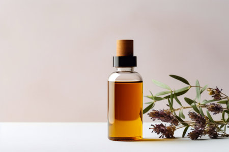 glass bottle of flower essence on a light backdrop, created with generative ai