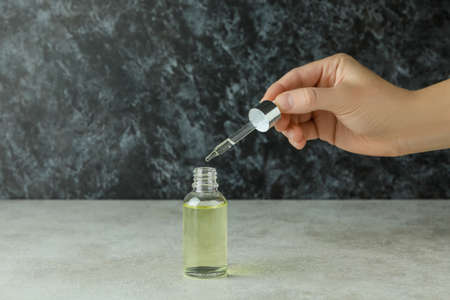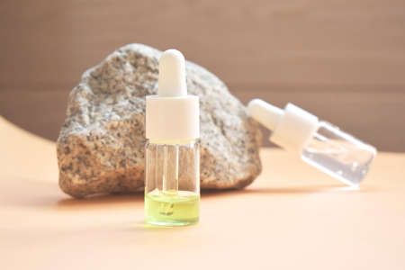 A bottle of essential oil with a glass pipette on a beige background. Natural skin care cosmetics.