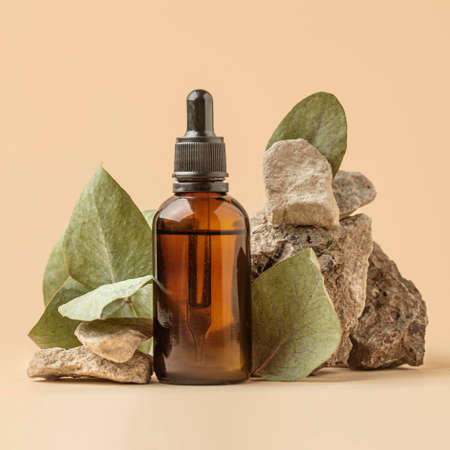 Cosmetic oil in a bottle with a pipette for the face and body on a natural background with a decor in the form of a natural stone. Space for text.