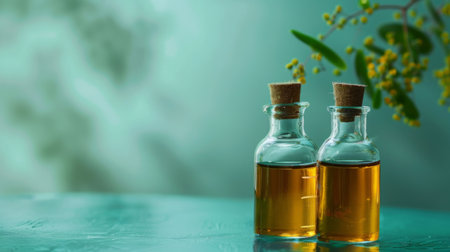 Bottle of essential oils next to plant with leaves. Generative AI.