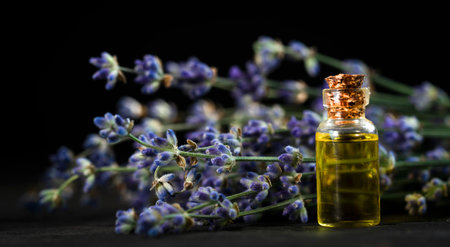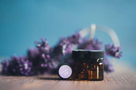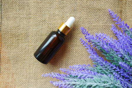 Lavender essential oil in a small bottle. Selective focus.nature.