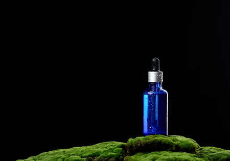blue glass bottle with pipette stands on green moss, black background. Cosmetics SPA branding mockup