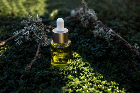 Bottle with dropper with oil on pillow of thyme leaves. Front view