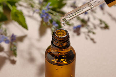 Essential oil with sage leaves extract. Hygiene bath product. Wellness therapy regeneration