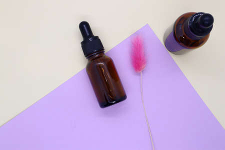 Liquid face serum in a glass bottles with a dropper. Essence of skin care for health and beauty. Copy space