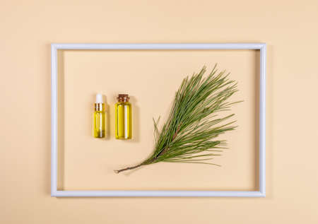 Christmas aromatherapy and spa concept with small glass bottles with coniferous cedar spa aromatic essential oil inside white frame on beige background. View from above.