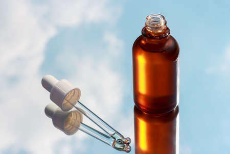 Liquid face serum in a glass bottles with a dropper. Essence of skin care for health and beauty.