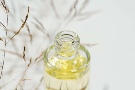 Open transparent bottle without cap with serum or essential oil with beautiful wild grass. White background with daylight and beautiful shadows. Beauty concept for face and body care