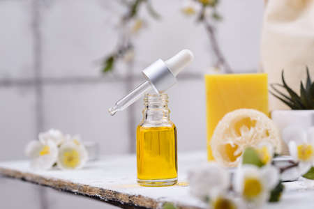 Natural herbal serum or oil in glass dropper bottle with a pipette Beauty spa product