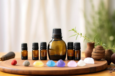 pure essential oils arranged near an aromatherapy diffuser, created with generative ai