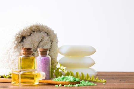 Beautiful spa composition with candles, frangipani flower, oil flasks, bowl with salt and herbal ball. Copy space.