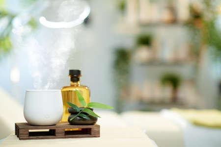 Ayurveda aromatherapy massage, female hand pouring aromatic oil in an essential oil diffuser