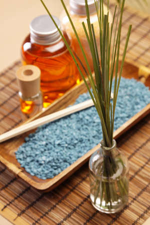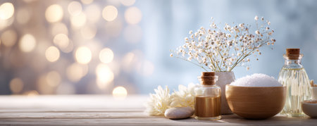 Relaxing spa setting with essential oil, salt, flowers, and soft bokeh light creating calm and soothing atmosphere