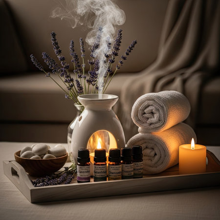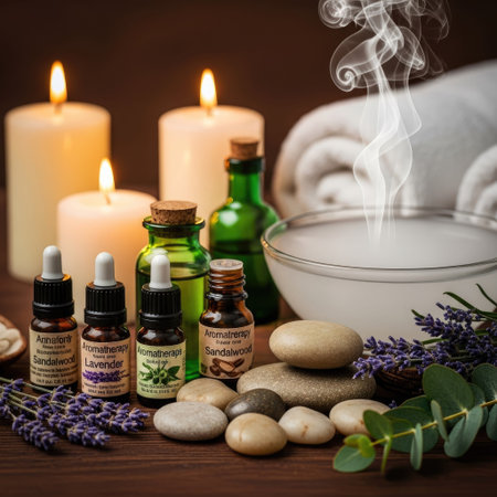 An arrangement features essential oil bottles, a lit candle, and a diffuser emitting steam. The composition showcases various botanical elements and soft lighting, creating a calm ambiance. Suitable for illustrating wellness, spa, or meditation concepts. It can also be utilized for cosmetic or aromatherapy promotion.