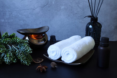 white clean cotton spa towel cloths prepared for day spa service on the black table with aroma oil burner, essential oil and reed diffuser with cement wall in nice luxury day spa in Thailand