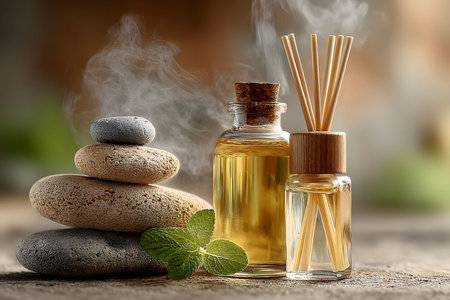 Aromatherapy Spa Scene with Scented Oils and Stone Balance for Relaxation Design Generative AI