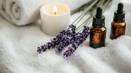 A calming scene of spa essentials laid out on a white towel, including a lavender sprig, essential oils, and a plush towel,