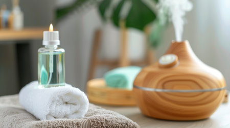 A serene arrangement featuring a bottle of essential oil, a soft towel, and a wooden diffuser in a calming indoor space, perfect for relaxation.