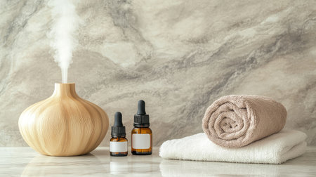This image captures a serene aromatherapy setting featuring a wooden diffuser, essential oil bottles, and plush towels, ideal for promoting relaxation and wellness at home.