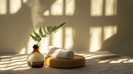 Discover a serene home spa scene featuring an essential oil diffuser, a fresh fern, and soft towels, illuminated by gentle natural light and calming shadows.