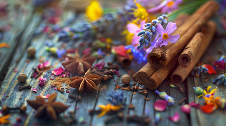A close-up image of a collection of fragrant spices and fresh flowers arranged on a wooden surface. Cinnamon sticks, star anise, and cloves mingle with lavender and rose petals, creating a visually appealing and aromatic scene.
