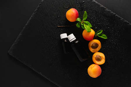 Dark bottles with cosmetic apricot oil lie on a dark background with ripe apricot fruits.
