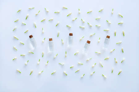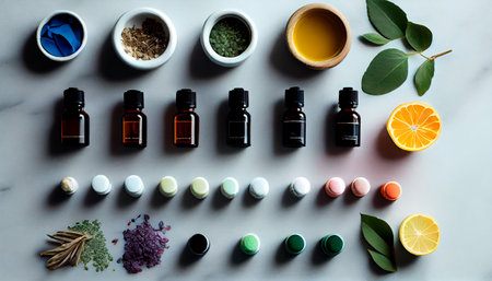 A top view of a collection of essential oils arranged on a white stone table. Ideal for promoting aromatherapy and natural remedies. Generative AI illustration
