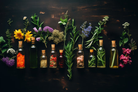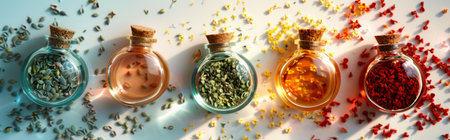 A visually appealing arrangement of glass bottles filled with natural herbs and ingredients, surrounded by flowers and spices, perfect for wellness and beauty themes.
