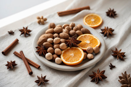A festive still life presents walnuts, hazelnuts, orange slices, and star anise on a plate, complemented by cinnamon sticks on a light fabric.