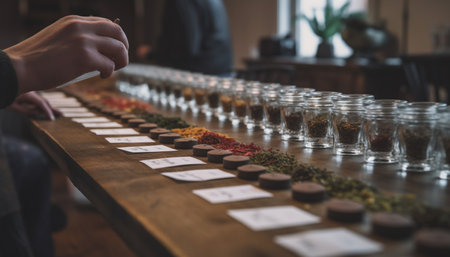 Glass bottles filled with various herbs and spices, arranged neatly on a table. Perfect for themes related to cooking, natural ingredients, and kitchen decor.