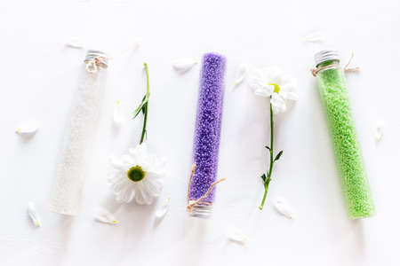 Natural herbal sea salt with aromatic lavender - perfect for relaxation. Cosmetic jars and bottles with salt, lavender flowers, bath bomb