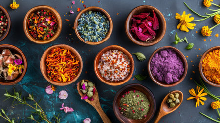 An assortment of colorful spices and herbs arranged in wooden bowls on a dark surface, highlighting the variety and vibrancy of culinary ingredients.