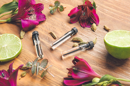 A visually appealing arrangement of fresh flowers, aromatic herbs, natural spices, and essential oil vials atop a gray surface, showcasing wellness and beauty.