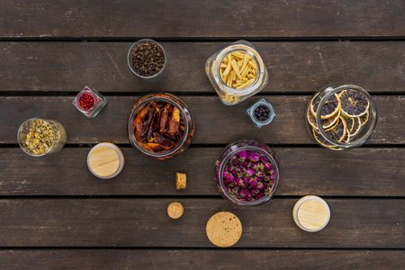 A variety of herbal teas in glass jars with dried flowers and herbs around