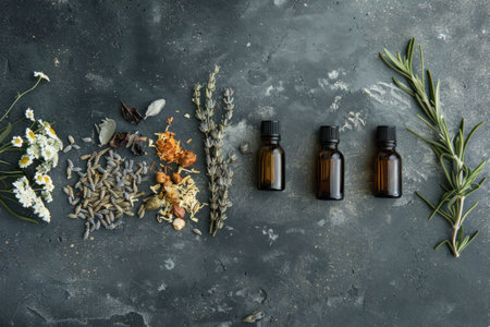 Herbal ingredients and essential oils arranged on a dark textured surface