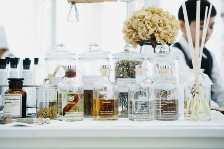 Essential oils and herbal extracts in small bottles. Selective focus. nature.