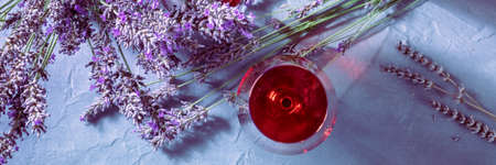 Rose wine and lavender panorama, shot from above, a flat lay panoramic banner for a French restaurant menu