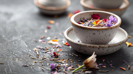 Dried flowers and herbs arranged in ceramic bowls on a dark textured background, showcasing a natural and rustic aesthetic.