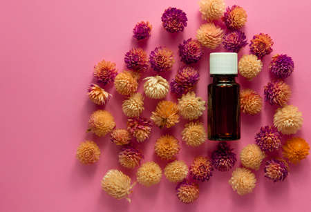 Herbal essential oil glass bottle mockup pink flowers background. Alternative medicine skin care spa aromatherapy, body treatment, blank beauty cosmetic product template. Massage oil, skincare essence