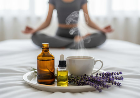 A wellness tray featuring amber essential oil bottles, fresh lavender flowers, and a steaming cup of tea rests on a white bedsheet while a blurred woman practices meditation in the background.